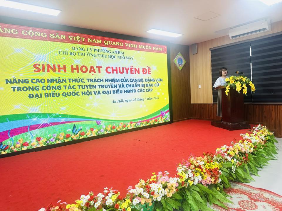 Chiều ngày 05/03/2026, Chi bộ nhà trường tổ chức buổi sinh hoạt chuyên đề với nội dung: “Nâng cao nhận thức, trách nhiệm của cán bộ, đảng viên trong công tác tuyên truyền và chuẩn bị bầu cử đại biểu Quốc hội và đại biểu Hội đồng nhân dân các cấp.”