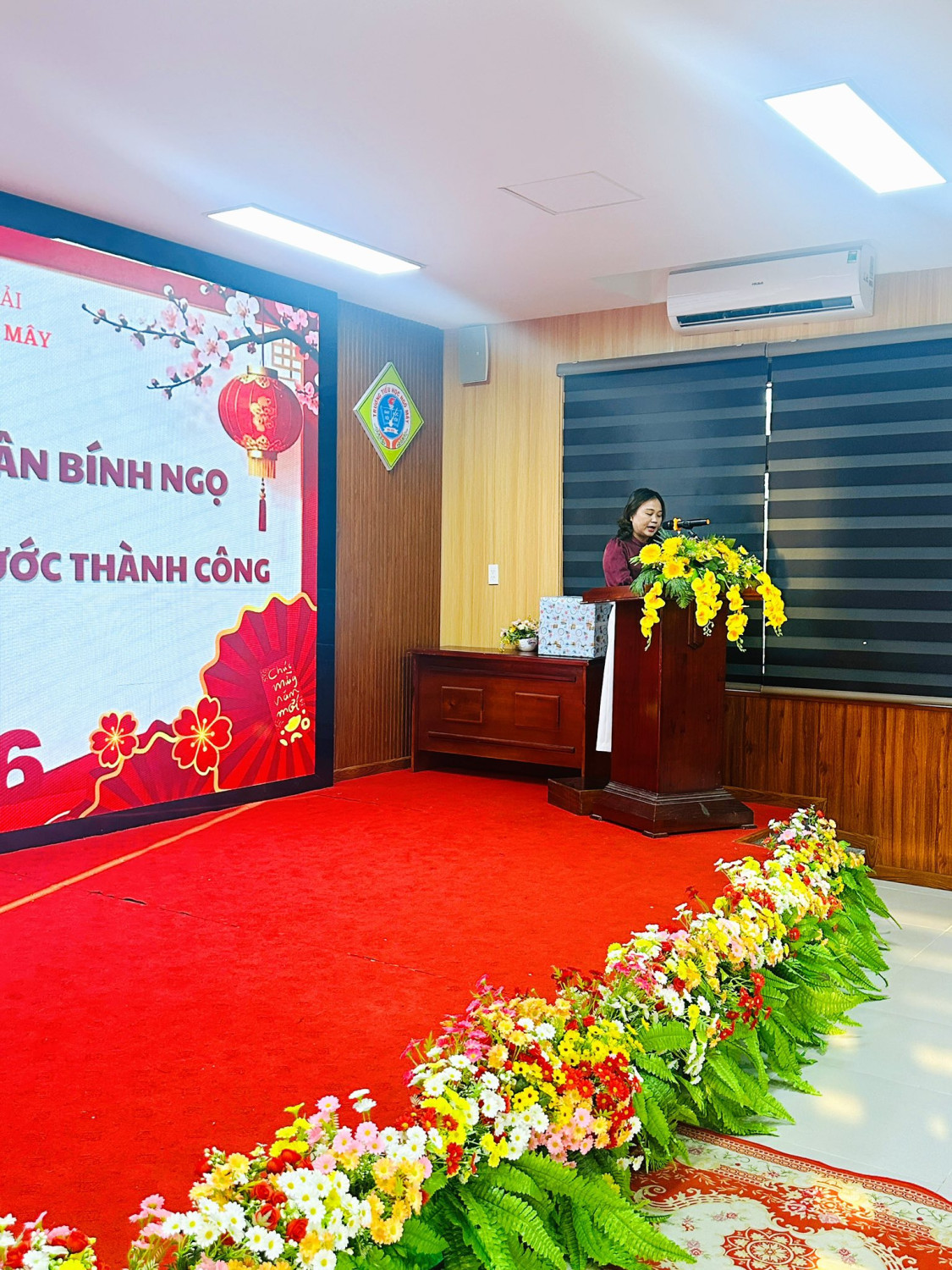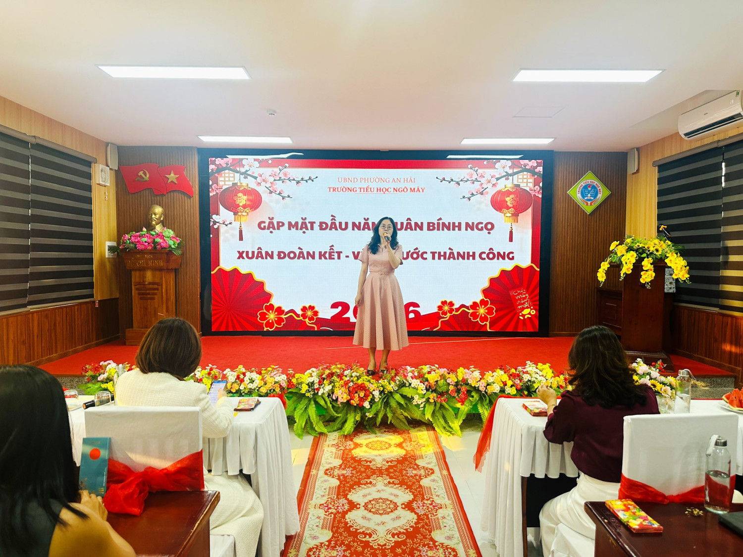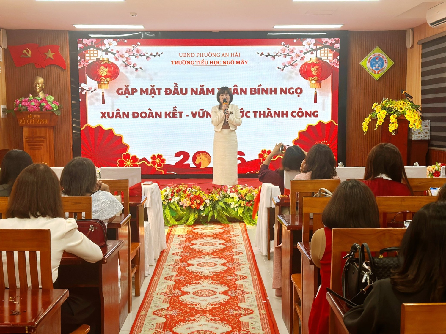 Mở đầu chương trình là phát biểu khai xuân của cô Lê Thị Em - Bí thư Chi bộ, Hiệu trưởng, gửi lời chúc mừng năm mới an khang, hạnh phúc đến toàn thể cán bộ, giáo viên, nhân viên; đồng thời ghi nhận những nỗ lực, thành quả đạt được trong năm qua của toàn thể hội đồng và bày tỏ kỳ vọng về một năm mới nhiều khởi sắc.